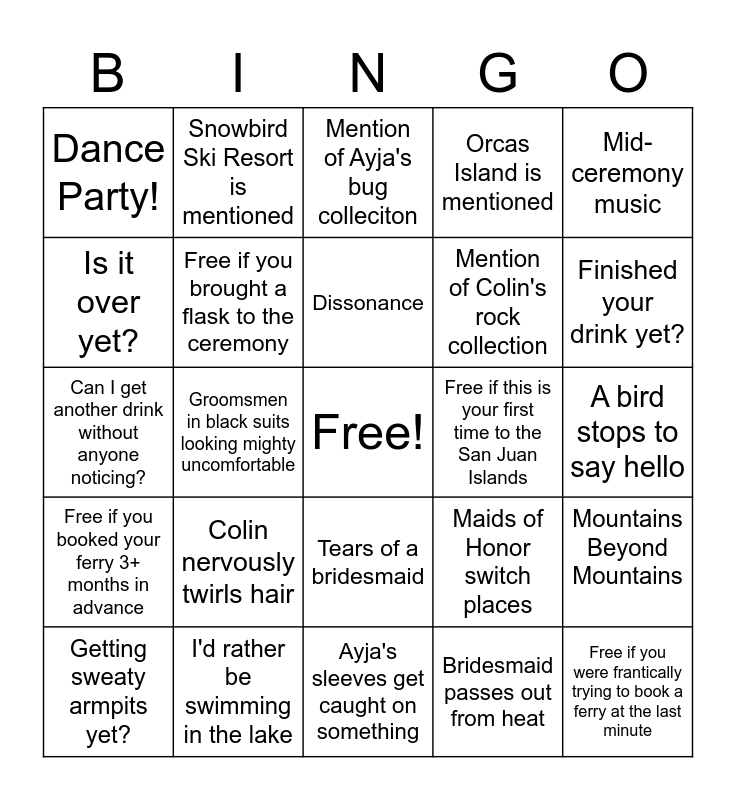 This bingo card has a free space and 24 words: Colin nervously twirls hair, I'd rather be swimming in the lake, Dissonance, Getting sweaty armpits yet?, Mid-ceremony music, Dance Party!, Is it over yet?, Snowbird Ski Resort is mentioned, Free if this is your first time to the San Juan Islands, Tears of a bridesmaid, Mention of Colin's rock collection, Can I get another drink without anyone noticing?, Maids of Honor switch places, Mountains Beyond Mountains, Free if you brought a flask to the ceremony, Bridesmaid passes out from heat, A bird stops to say hello, Mention of Ayja's bug colleciton, Finished your drink yet?, Groomsmen in black suits looking mighty uncomfortable, Free if you were frantically trying to book a ferry at the last minute, Free if you booked your ferry 3+ months in advance, Orcas Island is mentioned and Ayja's sleeves get caught on something.