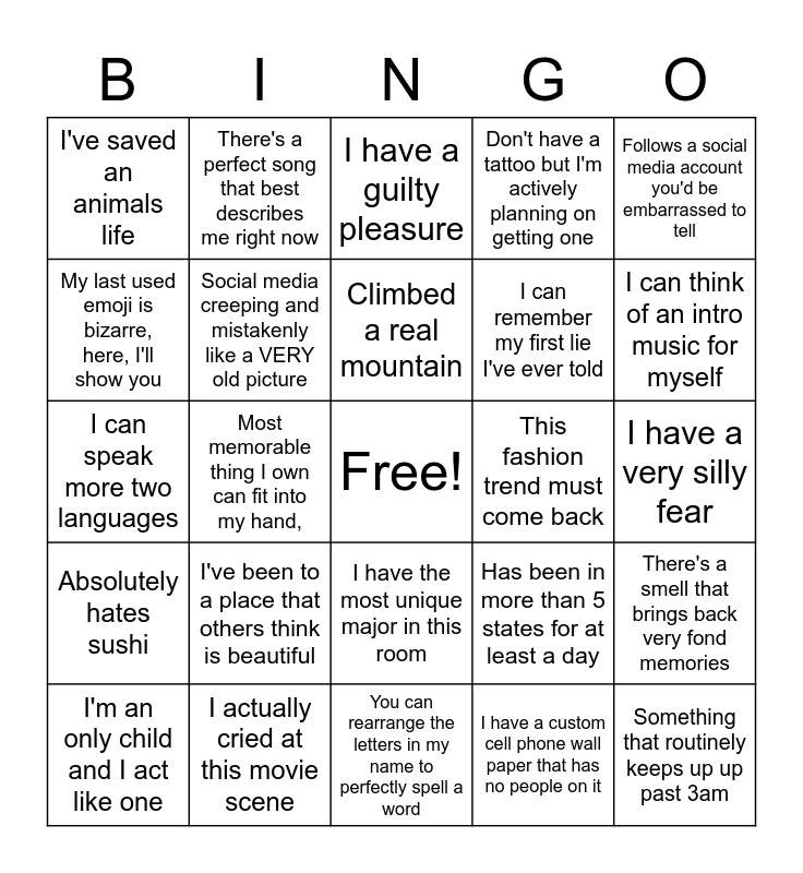 This bingo card has a free space and 36 words: Caught taking a secret picture of someone, Gossiping on text msg, sent to wrong person, Walking into wrong room with the wrong people, Social media creeping and mistakenly like a VERY old picture, Has been in more than 5 states for at least a day, Absolutely hates sushi, Climbed a real mountain, Obsessed with a boy band, Follows a social media account you'd be embarrassed to tell, Perfect weekend . . . sleeping, Most memorable thing I own can fit into my hand,, Don't have a tattoo but I'm actively planning on getting one, I have a pet that's not a dog or a cat, This fashion trend must come back, I can think of an intro music for myself, I've saved an animals life, I'm VERY organized, like obnoxiously organized, I've been to a place that others think is beautiful, Something that routinely keeps up up past 3am, I have a guilty pleasure, I have a very silly fear, There's a smell that brings back very fond memories, I actually cried at this movie scene, I'm an only child and I act like one, You can rearrange the letters in my name to perfectly spell a word, There's a perfect song that best describes me right now, I can speak more two languages, I can pinpoint a lifechanging moment in my life, I can remember my first lie I've ever told, My last used emoji is bizarre, here, I'll show you, I worked a job I wouldn't wish upon anyone, I actually have a favorite plant, I have a custom cell phone wall paper that has no people on it, I have the most unique major in this room, I've recently binged watched a series and I've got an interesting scar and a story that goes with it.