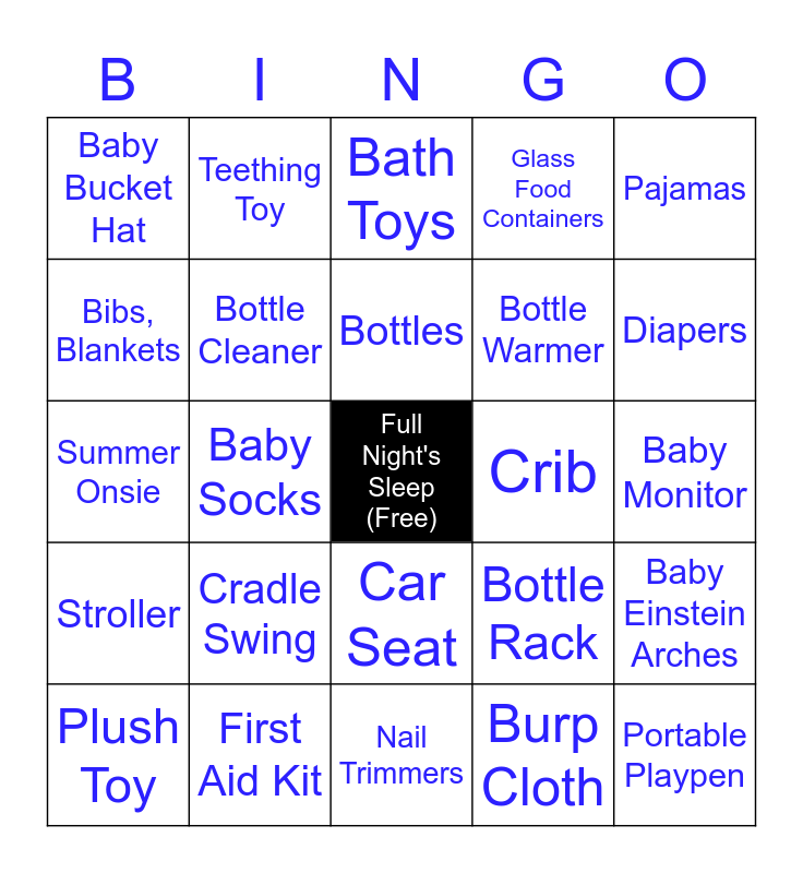 This bingo card has a free space and 31 words: Nail Trimmers, Baby Shoes, Baby Socks, Baby Swimsuit, Baby Bucket Hat, Bath Toys, Bottle Cleaner, Bottle Rack, Crib, Burp Cloth, Baby Monitor, Portable Playpen, Diaper Backpack, Stroller Organizer, Diapers, Pacifier, Baby Einstein Arches, Cradle Swing, Stroller, Car Seat, Pajamas, Book, Plush Toy, Teething Toy, Bottle Warmer, Bibs, Blankets, Glass Food Containers, Summer Onsie, First Aid Kit, Bottles and Rash Cream.