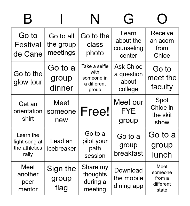 This bingo card has a free space and 24 words: Lead an icebreaker, Sign the group flag, Take a selfie with someone in a different group, Meet another peer mentor, Receive an acorn from Chloe, Go to Festival de Cane, Go to the glow tour, Go to all the group meetings, Meet our FYE group, Go to a pilot your path session, Ask Chloe a question about college, Get an orientation shirt, Go to a group breakfast, Go to a group lunch, Go to a group dinner, Download the mobile dining app, Spot Chloe in the skit show, Go to the class photo, Go to meet the faculty, Meet someone new, Meet someone from a different state, Learn the fight song at the athletics rally, Learn about the counseling center and Share my thoughts during a meeting.