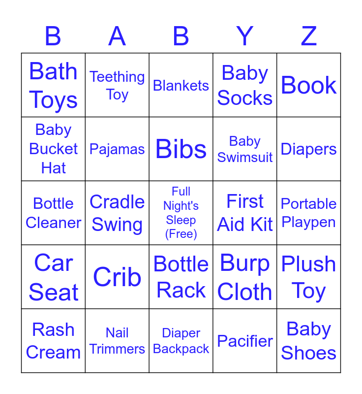 This bingo card has a free space and 32 words: Pacifier, Baby Einstein Arches, Cradle Swing, Stroller, Car Seat, Pajamas, Book, Plush Toy, Teething Toy, Bottle Warmer, Bibs, Blankets, Glass Food Containers, Summer Onsie, First Aid Kit, Bottles, Rash Cream, Bottle Cleaner, Bottle Rack, Crib, Burp Cloth, Baby Monitor, Portable Playpen, Nail Trimmers, Baby Shoes, Baby Socks, Baby Swimsuit, Baby Bucket Hat, Bath Toys, Diaper Backpack, Stroller Organizer and Diapers.