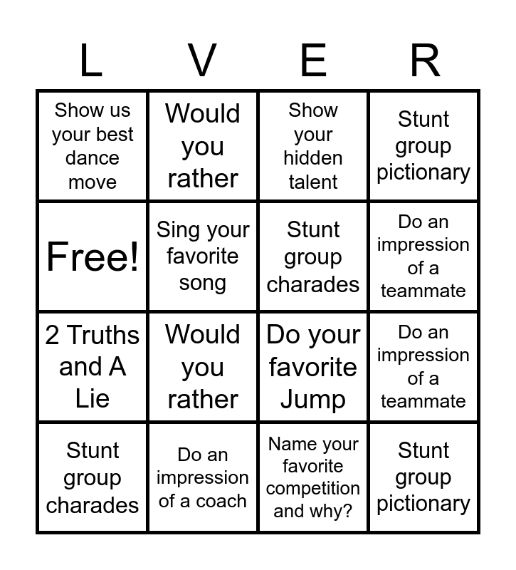 This bingo card has 16 words: Do an impression of a coach, Do an impression of a teammate, Show your hidden talent, Show us your best dance move, 2 Truths and A Lie, Would you rather, Do your favorite Jump, Name your favorite competition and why?, Free!, Sing your favorite song, Stunt group charades, Stunt group pictionary, Would you rather, Do an impression of a teammate, Stunt group charades and Stunt group pictionary.