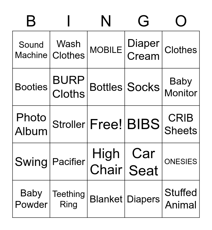This bingo card has a free space and 24 words: Pacifier, Teething Ring, Bottles, Baby Powder, Clothes, Sound Machine, Booties, Wash Clothes, BIBS, High Chair, Socks, Photo Album, Car Seat, ONESIES, BURP Cloths, Diapers, CRIB Sheets, MOBILE, Baby Monitor, Stroller, Stuffed Animal, Swing, Diaper Cream and Blanket.