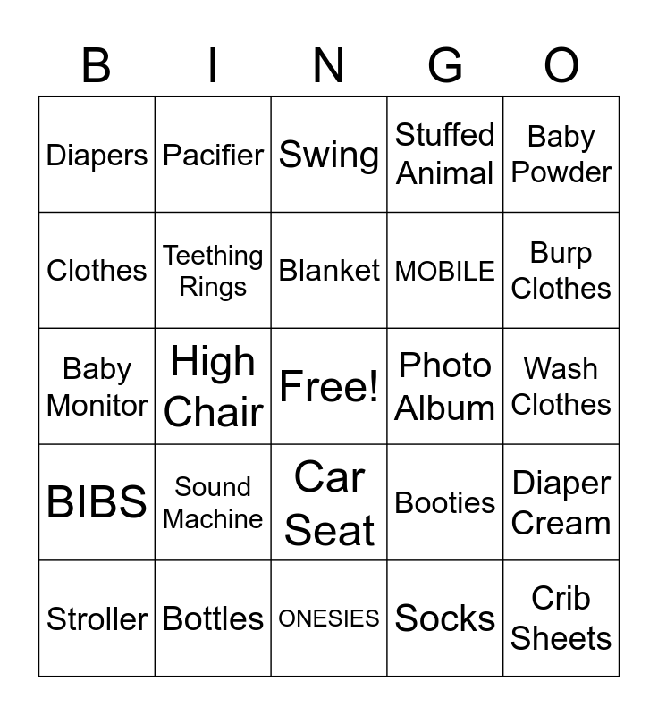 This bingo card has a free space and 24 words: Sound Machine, Bottles, Blanket, Stroller, Baby Powder, Diapers, Clothes, Pacifier, Photo Album, Car Seat, MOBILE, Baby Monitor, Booties, Diaper Cream, Teething Rings, Socks, Wash Clothes, Swing, Burp Clothes, High Chair, Crib Sheets, BIBS, Stuffed Animal and ONESIES.