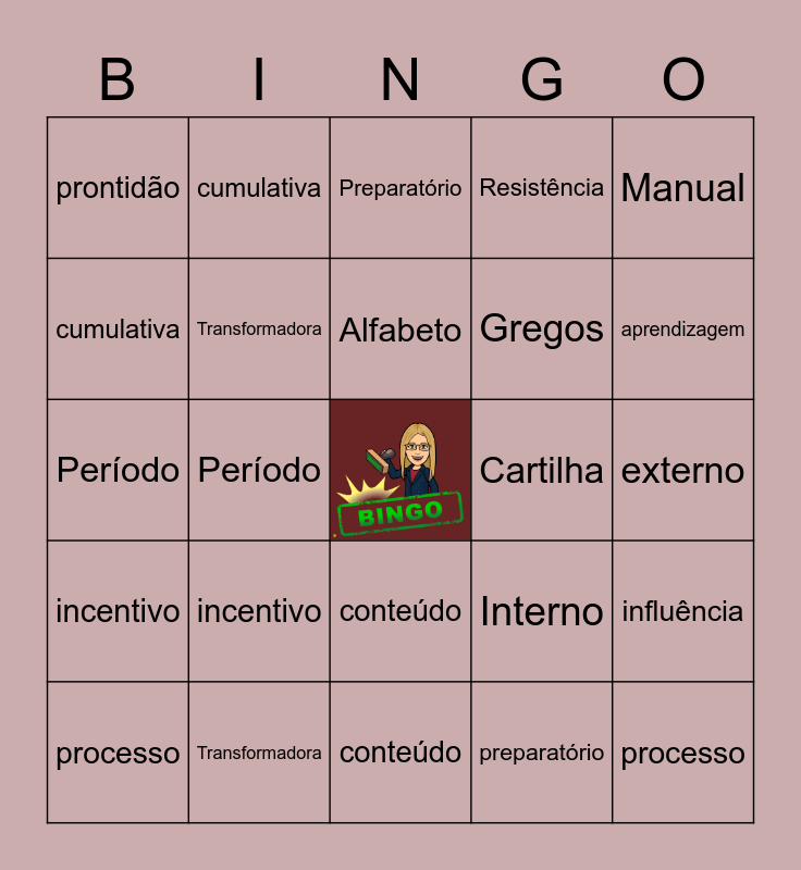 This bingo card has a free space and 49 words: aprendizagem, processo, interação, conteúdo, incentivo, ambiente, cumulativa, assimilativa, cumulativa, acomodativa, Transformadora, Resistência, influência, Interno, externo, Acrofônico, Alfabeto, Cartilha, Imprensa, Manual, Período, preparatório, prontidão, Gregos, Romanos, aprendizagem, processo, interação, conteúdo, incentivo, ambiente, assimilativa, cumulativa, acomodativa, Transformadora, Resistência, influência, Interno, externo, Acrofônico, Alfabeto, Cartilha, Imprensa, Manual, Período, Preparatório, Prontidão, Gregos and Romanos.
