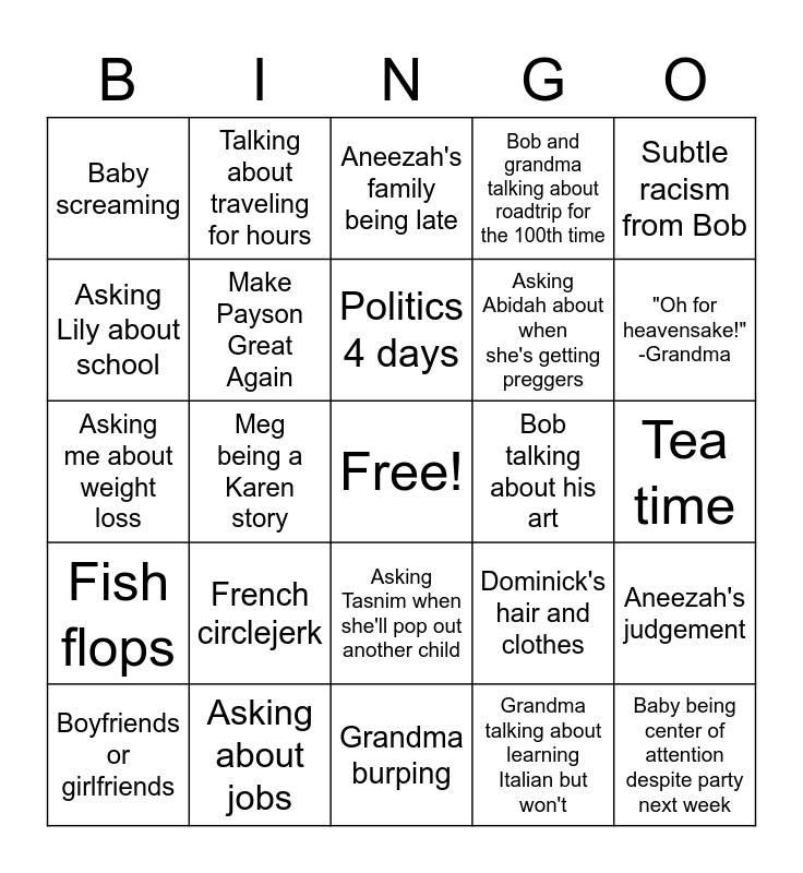 This bingo card has a free space and 24 words: French circlejerk, Asking about jobs, Politics 4 days, Boyfriends or girlfriends, Subtle racism from Bob, Baby screaming, Asking Lily about school, Talking about traveling for hours, Bob talking about his art, Asking Tasnim when she'll pop out another child, Asking Abidah about when she's getting preggers, Asking me about weight loss, Dominick's hair and clothes, Aneezah's judgement, Make Payson Great Again, Grandma talking about learning Italian but won't, Tea time, Aneezah's family being late, "Oh for heavensake!" -Grandma, Meg being a Karen story, Baby being center of attention despite party next week, Fish flops, Bob and grandma talking about roadtrip for the 100th time and Grandma burping.