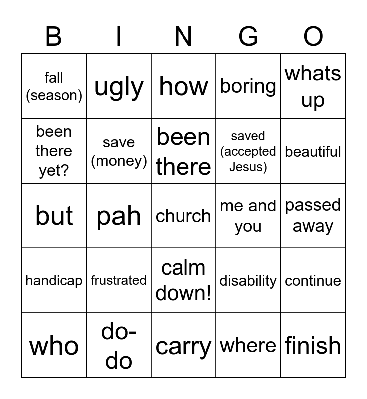 This bingo card has 45 words: for-for, church, happen, who, what, where, how, fine, whats up, do-do, boring, me and you, calm down!, frustrated, kids, carry, different, but, wow, beautiful, ugly, dry, summer, fall (season), fall (fall down, fail), passed away, chocolate, crazy, disability, handicap, proud, continue, keep, be careful, motormouth, pah, cha, lo-lo-lo-lo, finish, been there, been there yet?, saved (accepted Jesus), coronovirus, save (money) and Savior.