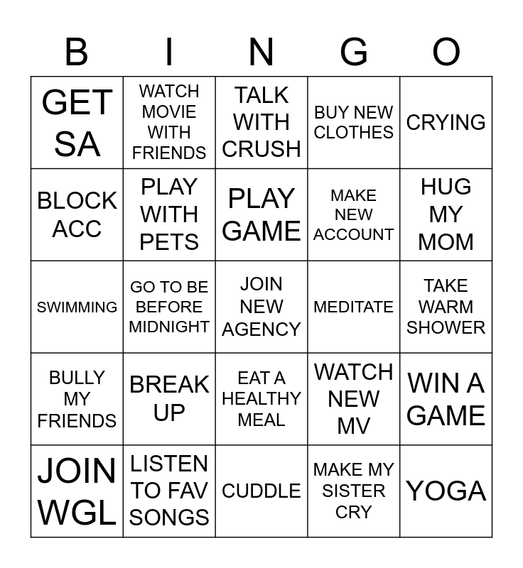 This bingo card has 25 words: BREAK UP, CUDDLE, PLAY GAME, JOIN WGL, CRYING, GET SA, BLOCK ACC, WATCH MOVIE WITH FRIENDS, MEDITATE, EAT A HEALTHY MEAL, MAKE NEW ACCOUNT, SWIMMING, WATCH NEW MV, WIN A GAME, PLAY WITH PETS, YOGA, TAKE WARM SHOWER, TALK WITH CRUSH, HUG MY MOM, GO TO BE BEFORE MIDNIGHT, JOIN NEW AGENCY, LISTEN TO FAV SONGS, BULLY MY FRIENDS, BUY NEW CLOTHES and MAKE MY SISTER CRY.