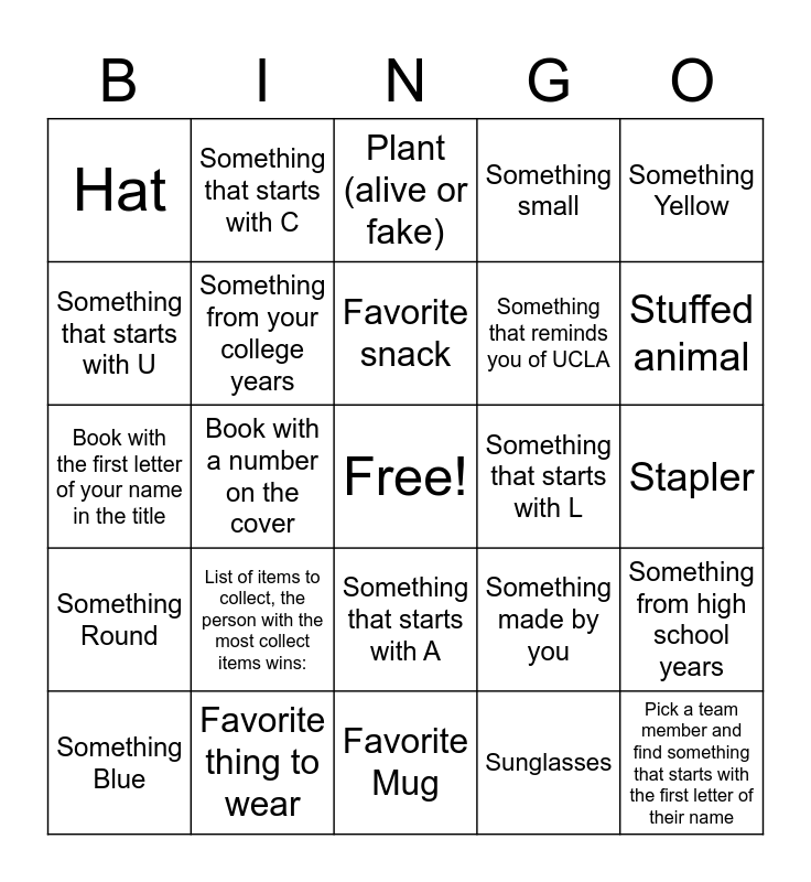 This bingo card has a free space and 25 words: List of items to collect, the person with the most collect items wins:, Favorite Mug, Favorite snack, Something Blue, Something Yellow, Hat, Something that starts with U, Something that starts with C, Something that starts with L, Something that starts with A, Something that reminds you of UCLA, Book with the first letter of your name in the title, Something made by you, Something from high school years, Something from your college years, Pencil, Stapler, Plant (alive or fake), Stuffed animal, Book with a number on the cover, Pick a team member and find something that starts with the first letter of their name, Favorite thing to wear, Something Round, Something small and Sunglasses.