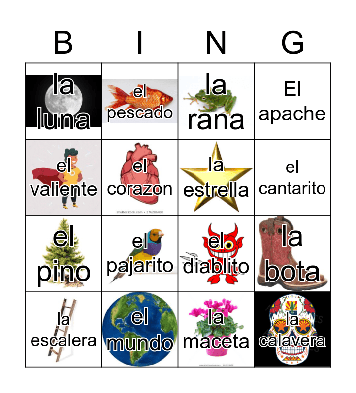 This bingo card has 37 images and 42 words: la campana, el cantarito, el venado, el cazo, la bandera, el barril, la escalera, la mano, la rana, el arpa, la maceta, el pajarito, la bota, el valiente, el nopal, el melon, la corona, el diablito, el tambor, el pescado, el corazon, la garza, la sirena, la luna, la palma, la pera, el pino, el gallo, la rosa, el alacran, el camaron, la calavera, la estrella, el sol, el arbol, el paraguas, la sandia, el mundo, El borracho, Las jaras, El apache and La chalupa.