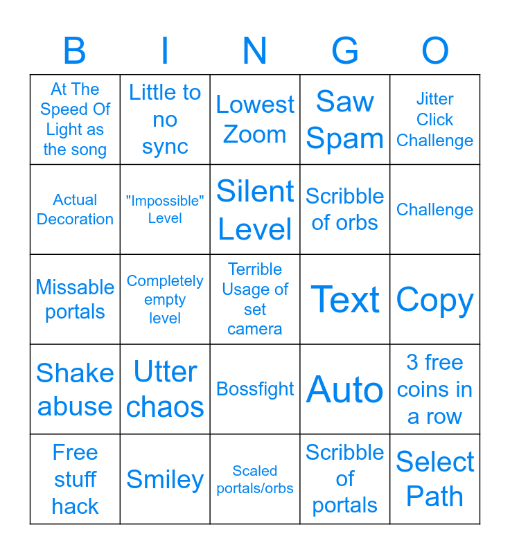 This bingo card has 30 words: Smiley, Soundtrack from OG GD levels, Completely empty level, Secret Way, At The Speed Of Light as the song, Lowest Zoom, "Impossible" Level, Bossfight, Text, Scaled portals/orbs, Copy, Terrible Usage of set camera, Scribble of portals, Select Path, Challenge, At the end triple spike, Auto, Shake abuse, Utter chaos, Jitter Click Challenge, Missable portals, Naked Spikes, Little to no sync, Scribble of orbs, Actual Decoration, Saw Spam, 3 free coins in a row, Free stuff hack, Silent Level and Level 1 Level.