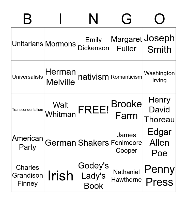 This bingo card has a free space and 24 words: German, Irish, nativism, Charles Grandison Finney, Joseph Smith, Unitarians, Universalists, Mormons, Brooke Farm, Shakers, Romanticism, Transcendentalism, James Fenimoore Cooper, Edgar Allen Poe, Herman Melville, Nathaniel Hawthorne, Henry David Thoreau, Emily Dickenson, Washington Irving, Walt Whitman, Penny Press, American Party, Margaret Fuller and Godey's Lady's Book.