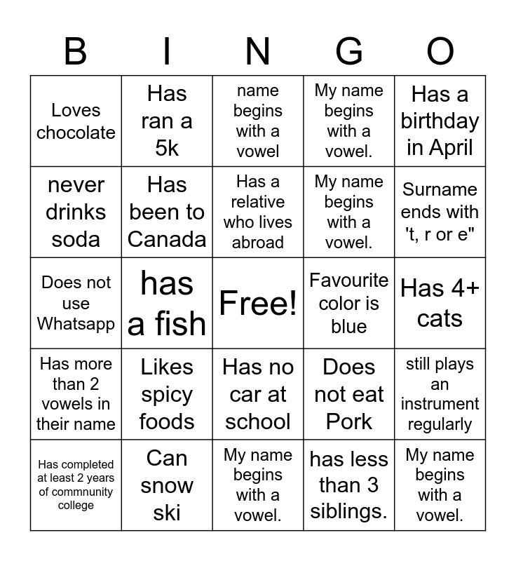 This bingo card has a free space and 34 words: Graduated with HS honors, has less than 3 siblings., Wore braces, Has read two books in the past month, Has more than 2 vowels in their name, Has been to Canada, Has a birthday in April, Has completed at least 2 years of commnunity college, Has ran a 5k, Has 3+ dogs, Has a relative who lives abroad, name begins with a vowel, Is left-handed, Is wearing brown, Favourite color is blue, Surname ends with 't, r or e", Can snow ski, Does not use Whatsapp, Likes spicy foods, Does not eat Pork, Has no car at school, Dislikes cheesecake, Loves chocolate, Has 4+ cats, My name begins with a vowel., My name begins with a vowel., My name begins with a vowel., My name begins with a vowel., My name begins with a vowel., never drinks soda, read every Harry Potter book, has a fish, still plays an instrument regularly and acted in a HS play.