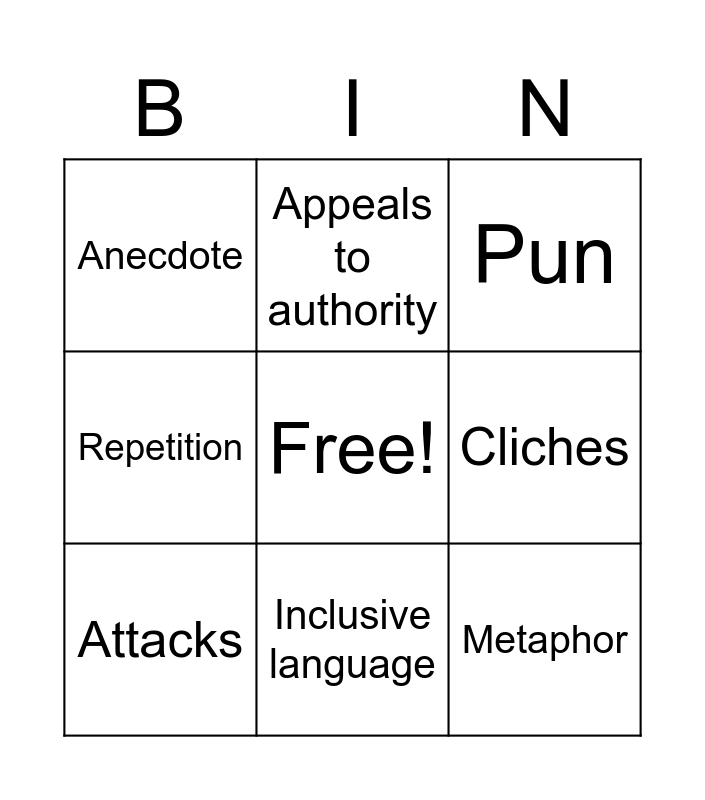 This bingo card has a free space and 8 words: Cliches, Pun, Appeals to authority, Attacks, Anecdote, Metaphor, Repetition and Inclusive language.