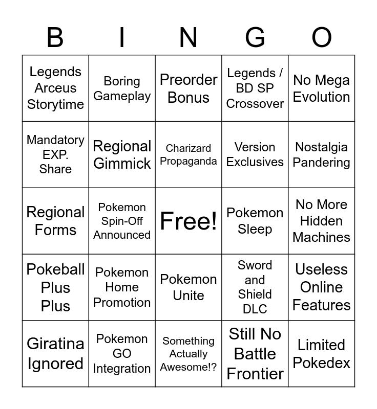 This bingo card has a free space and 24 words: Pokemon Home Promotion, Pokemon GO Integration, Charizard Propaganda, Giratina Ignored, No Mega Evolution, Legends Arceus Storytime, Mandatory EXP. Share, Boring Gameplay, Pokemon Sleep, Pokemon Unite, Version Exclusives, Regional Forms, Sword and Shield DLC, Useless Online Features, Regional Gimmick, Still No Battle Frontier, No More Hidden Machines, Preorder Bonus, Nostalgia Pandering, Pokemon Spin-Off Announced, Limited Pokedex, Pokeball Plus Plus, Legends / BD SP Crossover and Something Actually Awesome!?.