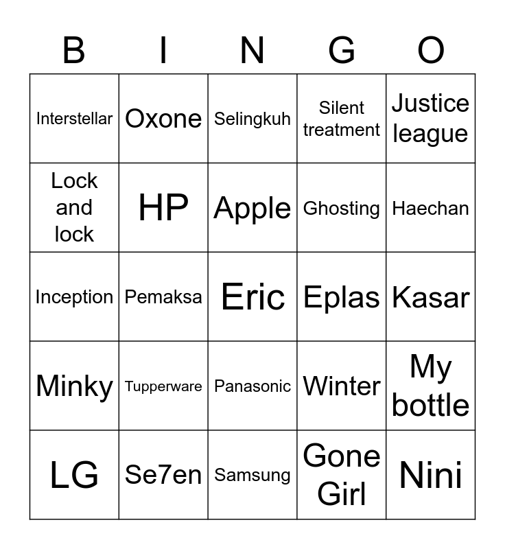 This bingo card has 25 words: Tupperware, Samsung, Apple, LG, Justice league, Interstellar, Lock and lock, Oxone, Eplas, Panasonic, Ghosting, Inception, Winter, My bottle, HP, Nini, Kasar, Selingkuh, Haechan, Pemaksa, Eric, Se7en, Minky, Silent treatment and Gone Girl.