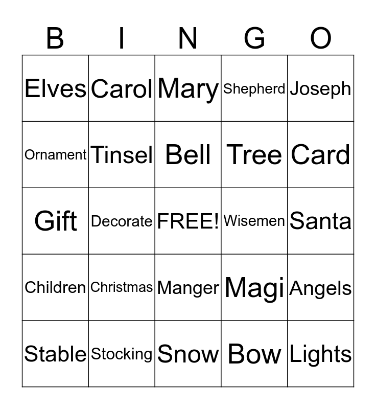 This bingo card has a free space and 24 words: Christmas, Stocking, Bell, Stable, Joseph, Elves, Ornament, Carol, Wisemen, Manger, Tree, Gift, Magi, Angels, Tinsel, Bow, Santa, Mary, Card, Decorate, Lights, Children, Shepherd and Snow.
