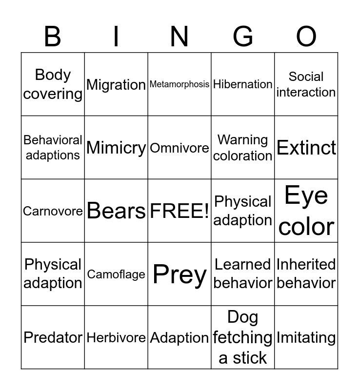 This bingo card has a free space and 24 words: Camoflage, Herbivore, Omnivore, Predator, Social interaction, Body covering, Behavioral adaptions, Migration, Physical adaption, Prey, Warning coloration, Carnovore, Learned behavior, Inherited behavior, Mimicry, Dog fetching a stick, Eye color, Metamorphosis, Extinct, Bears, Imitating, Physical adaption, Hibernation and Adaption.