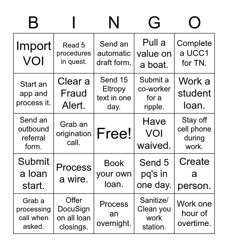 This bingo card has a free space and 24 words: Process a wire., Offer DocuSign on all loan closings., Send 15 Eltropy text in one day., Grab a processing call when asked., Complete a UCC1 for TN., Import VOI, Start an app and process it., Read 5 procedures in quest., Have VOI waived., Book your own loan., Submit a co-worker for a ripple., Send an outbound referral form., Send 5 pq's in one day., Create a person., Clear a Fraud Alert., Sanitize/ Clean you work station., Stay off cell phone during work., Send an automatic draft form., Work a student loan., Grab an origination call., Work one hour of overtime., Submit a loan start., Pull a value on a boat. and Process an overnight..