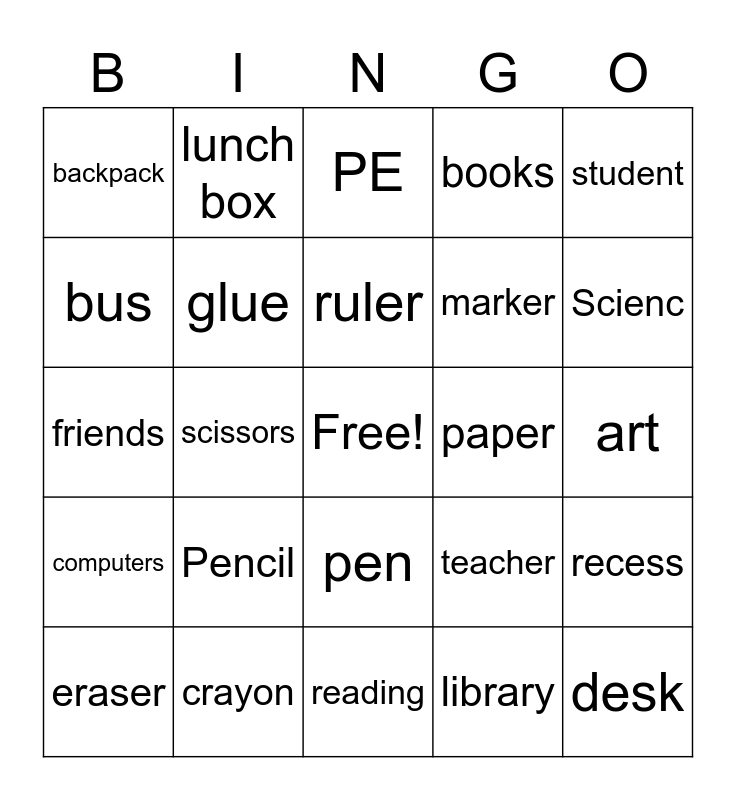 This bingo card has a free space and 24 words: Pencil, crayon, ruler, eraser, student, backpack, bus, lunch box, paper, pen, marker, friends, teacher, recess, glue, library, art, PE, Scienc, scissors, desk, computers, books and reading.