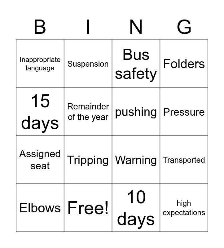 This bingo card has 16 words: Free!, Transported, Bus safety, Inappropriate language, Assigned seat, Suspension, Warning, 10 days, 15 days, Remainder of the year, Elbows, Folders, Tripping, Pressure, pushing and high expectations.