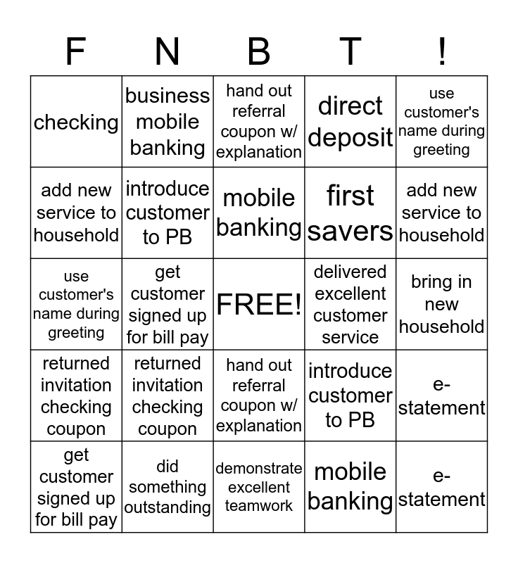 This bingo card has a free space and 24 words: returned invitation checking coupon, did something outstanding, mobile banking, get customer signed up for bill pay, use customer's name during greeting, checking, add new service to household, business mobile banking, delivered excellent customer service, hand out referral coupon w/ explanation, first savers, use customer's name during greeting, introduce customer to PB, e-statement, introduce customer to PB, mobile banking, bring in new household, hand out referral coupon w/ explanation, add new service to household, get customer signed up for bill pay, e-statement, returned invitation checking coupon, direct deposit and demonstrate excellent teamwork.