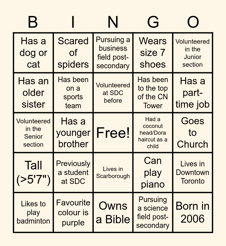 This bingo card has a free space and 24 words: Previously a student at SDC, Favourite colour is purple, Volunteered at SDC before, Likes to play badminton, Volunteered in the Junior section, Has a dog or cat, Has an older sister, Scared of spiders, Had a coconut head/Dora haircut as a child, Lives in Scarborough, Has been to the top of the CN Tower, Volunteered in the Senior section, Can play piano, Lives in Downtown Toronto, Has been on a sports team, Pursuing a science field post-secondary, Goes to Church, Pursuing a business field post-secondary, Has a part-time job, Has a younger brother, Born in 2006, Tall (>5'7"), Wears size 7 shoes and Owns a Bible.