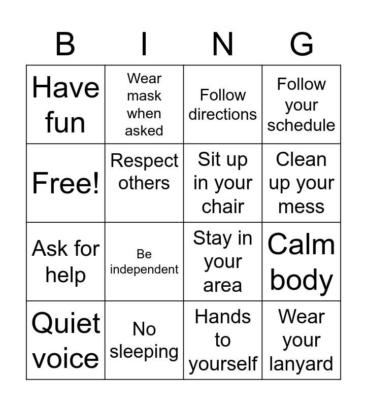 This bingo card has 16 words: No sleeping, Calm body, Follow directions, Have fun, Ask for help, Wear mask when asked, Stay in your area, Hands to yourself, Free!, Respect others, Quiet voice, Follow your schedule, Be independent, Clean up your mess, Sit up in your chair and Wear your lanyard.