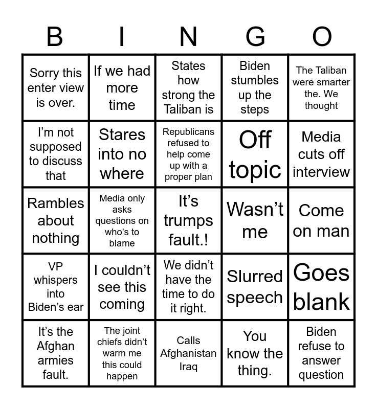 This bingo card has a free space and 24 words: I couldn’t see this coming, The joint chiefs didn’t warm me this could happen, Republicans refused to help come up with a proper plan, It’s the Afghan armies fault., The Taliban were smarter the. We thought, Sorry this enter view is over., I’m not supposed to discuss that, If we had more time, Wasn’t me, We didn’t have the time to do it right., Off topic, Rambles about nothing, Slurred speech, Goes blank, Stares into no where, You know the thing., Come on man, States how strong the Taliban is, Media cuts off interview, Media only asks questions on who’s to blame, Biden refuse to answer question, VP whispers into Biden’s ear, Biden stumbles up the steps and Calls Afghanistan Iraq.