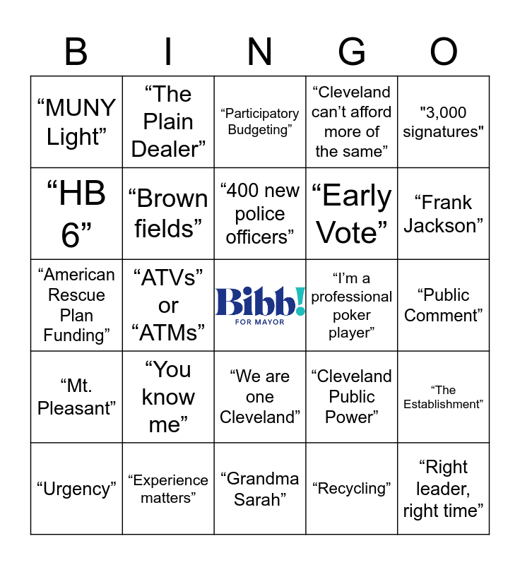 This bingo card has a free space and 24 words: “You know me”, “Experience matters”, “400 new police officers”, “Urgency”, "3,000 signatures", “MUNY Light”, “HB 6”, “The Plain Dealer”, “I’m a professional poker player”, “We are one Cleveland”, “Early Vote”, “American Rescue Plan Funding”, “Cleveland Public Power”, “The Establishment”, “Brown fields”, “Recycling”, “Public Comment”, “Participatory Budgeting”, “Frank Jackson”, “ATVs” or “ATMs”, “Right leader, right time”, “Mt. Pleasant”, “Cleveland can’t afford more of the same” and “Grandma Sarah”.