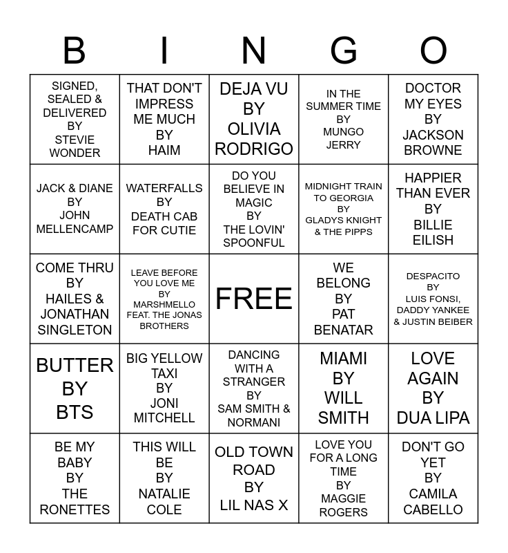 This bingo card has a free space and 24 words: BIG YELLOW TAXI BY JONI MITCHELL, THIS WILL BE BY NATALIE COLE, DO YOU BELIEVE IN MAGIC BY THE LOVIN' SPOONFUL, BE MY BABY BY THE RONETTES, DOCTOR MY EYES BY JACKSON BROWNE, SIGNED, SEALED & DELIVERED BY STEVIE WONDER, JACK & DIANE BY JOHN MELLENCAMP, THAT DON'T IMPRESS ME MUCH BY HAIM, WE BELONG BY PAT BENATAR, DANCING WITH A STRANGER BY SAM SMITH & NORMANI, MIDNIGHT TRAIN TO GEORGIA BY GLADYS KNIGHT & THE PIPPS, COME THRU BY HAILES & JONATHAN SINGLETON, MIAMI BY WILL SMITH, LOVE AGAIN BY DUA LIPA, WATERFALLS BY DEATH CAB FOR CUTIE, LOVE YOU FOR A LONG TIME BY MAGGIE ROGERS, DESPACITO BY LUIS FONSI, DADDY YANKEE & JUSTIN BEIBER, DEJA VU BY OLIVIA RODRIGO, HAPPIER THAN EVER BY BILLIE EILISH, LEAVE BEFORE YOU LOVE ME BY MARSHMELLO FEAT. THE JONAS BROTHERS, DON'T GO YET BY CAMILA CABELLO, BUTTER BY BTS, IN THE SUMMER TIME BY MUNGO JERRY and OLD TOWN ROAD BY LIL NAS X.