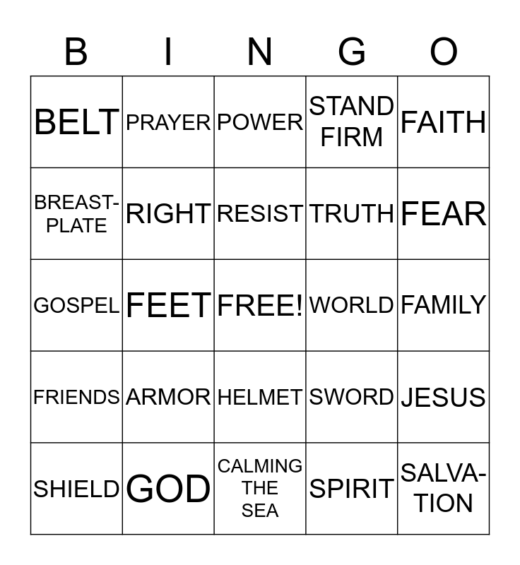 This bingo card has a free space and 24 words: ARMOR, GOD, RESIST, SHIELD, FAITH, BELT, BREAST- PLATE, PRAYER, WORLD, HELMET, TRUTH, GOSPEL, SWORD, JESUS, RIGHT, SPIRIT, FAMILY, POWER, FEAR, FEET, SALVA- TION, FRIENDS, STAND FIRM and CALMING THE SEA.