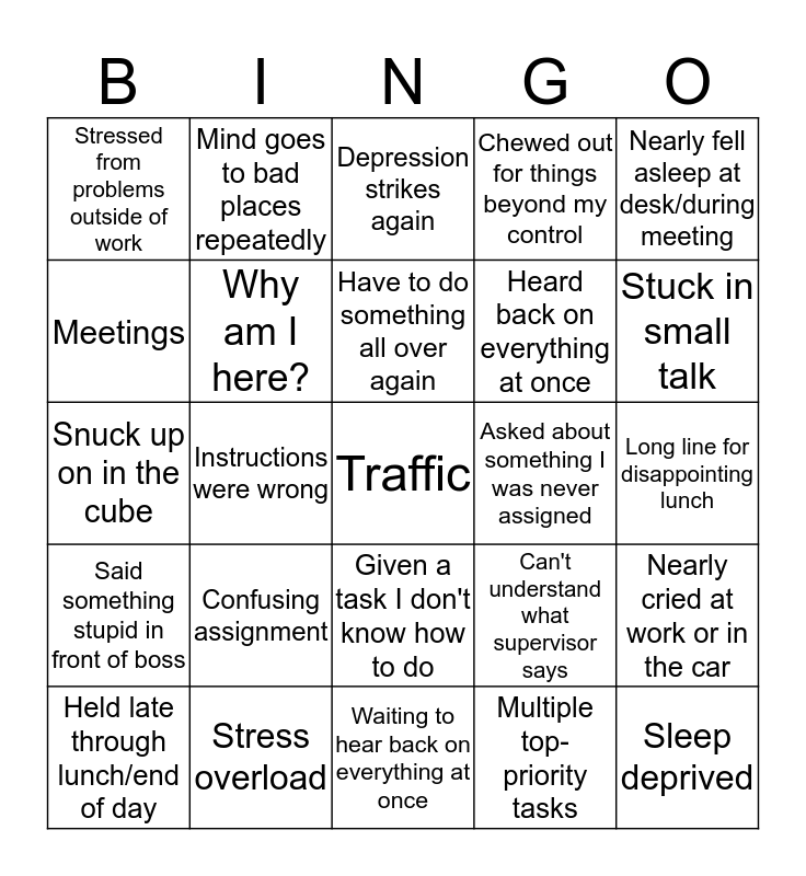 This bingo card has a free space and 24 words: Confusing assignment, Stress overload, Have to do something all over again, Held late through lunch/end of day, Nearly fell asleep at desk/during meeting, Stressed from problems outside of work, Meetings, Mind goes to bad places repeatedly, Asked about something I was never assigned, Given a task I don't know how to do, Heard back on everything at once, Snuck up on in the cube, Can't understand what supervisor says, Nearly cried at work or in the car, Why am I here?, Multiple top-priority tasks, Long line for disappointing lunch, Depression strikes again, Stuck in small talk, Instructions were wrong, Sleep deprived, Said something stupid in front of boss, Chewed out for things beyond my control and Waiting to hear back on everything at once.