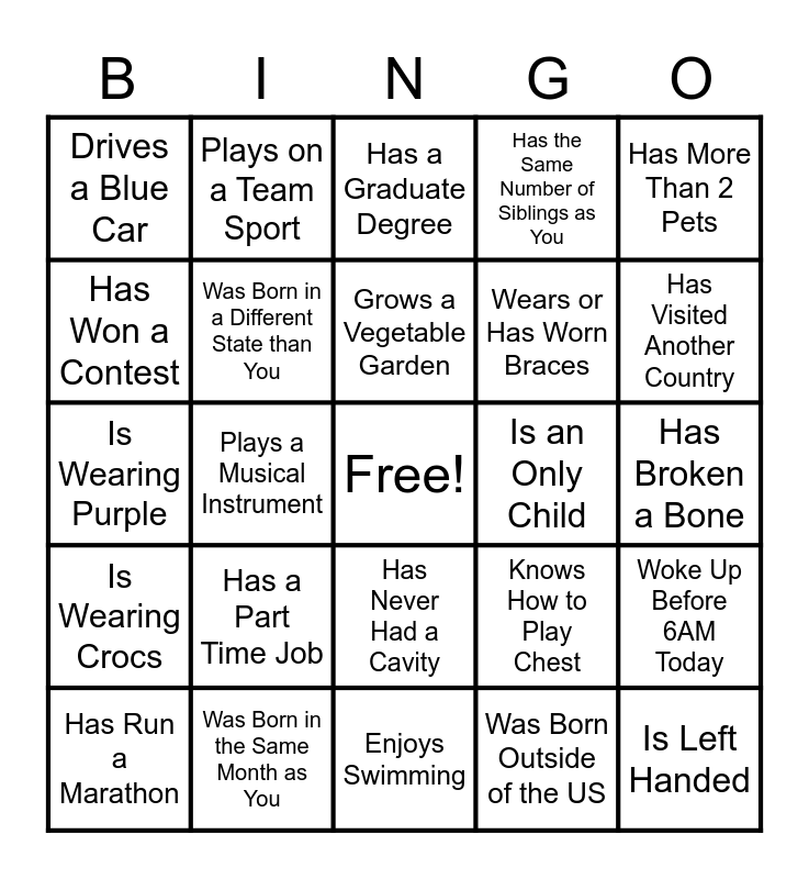 This bingo card has a free space and 24 words: Has Run a Marathon, Has a Part Time Job, Grows a Vegetable Garden, Was Born Outside of the US, Has More Than 2 Pets, Drives a Blue Car, Plays on a Team Sport, Has a Graduate Degree, Is an Only Child, Has Broken a Bone, Is Wearing Purple, Was Born in a Different State than You, Knows How to Play Chest, Woke Up Before 6AM Today, Has Won a Contest, Was Born in the Same Month as You, Enjoys Swimming, Has the Same Number of Siblings as You, Has Visited Another Country, Is Wearing Crocs, Plays a Musical Instrument, Has Never Had a Cavity, Wears or Has Worn Braces and Is Left Handed.
