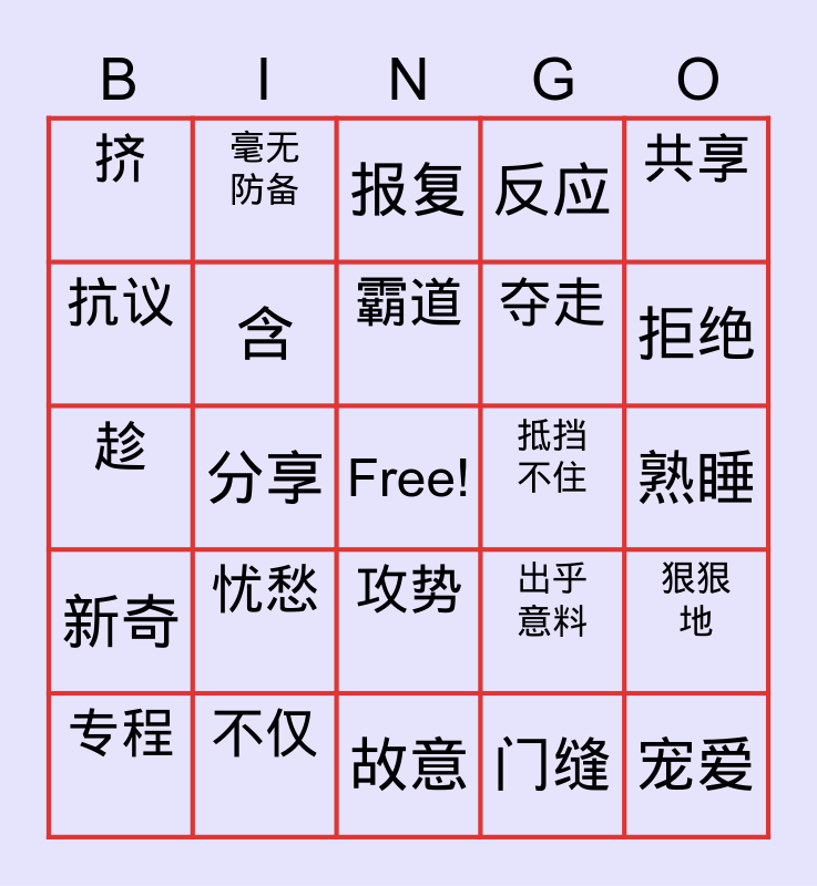 This bingo card has a free space and 24 words: 忧愁, 不仅, 霸道, 专程, 共享, 挤, 抗议, 毫无防备, 抵挡不住, 攻势, 夺走, 趁, 出乎意料, 狠狠地, 含, 门缝, 熟睡, 报复, 拒绝, 分享, 宠爱, 新奇, 反应 and 故意.