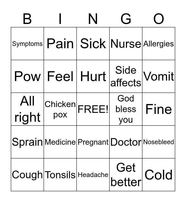 This bingo card has a free space and 24 words: Medicine, Tonsils, Hurt, Cough, Allergies, Symptoms, Pow, Pain, God bless you, Pregnant, Side affects, All right, Doctor, Nosebleed, Feel, Get better, Fine, Sick, Vomit, Chicken pox, Cold, Sprain, Nurse and Headache.