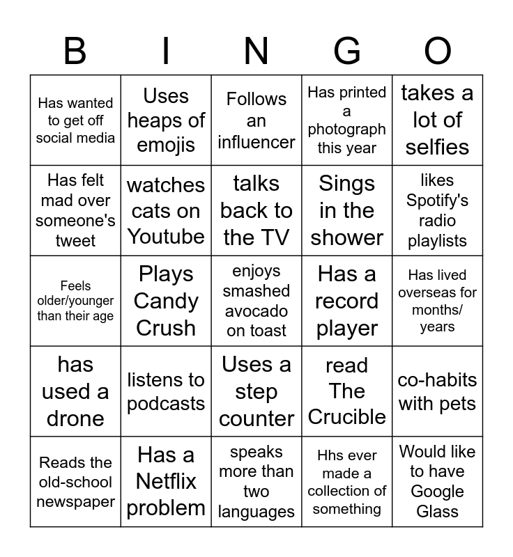 This bingo card has a free space and 24 words: listens to podcasts, Has a Netflix problem, talks back to the TV, Reads the old-school newspaper, takes a lot of selfies, Has wanted to get off social media, Has felt mad over someone's tweet, Uses heaps of emojis, Has a record player, Uses a step counter, Sings in the shower, Feels older/younger than their age, read The Crucible, co-habits with pets, watches cats on Youtube, Hhs ever made a collection of something, Has lived overseas for months/ years, Follows an influencer, likes Spotify's radio playlists, Plays Candy Crush, Would like to have Google Glass, has used a drone, Has printed a photograph this year and speaks more than two languages.