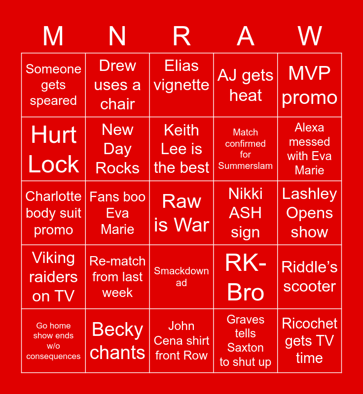 This bingo card has a free space and 24 words: Re-match from last week, Becky chants, Keith Lee is the best, Go home show ends w/o consequences, MVP promo, Someone gets speared, Hurt Lock, Drew uses a chair, Nikki ASH sign, Smackdown ad, Match confirmed for Summerslam, Charlotte body suit promo, RK-Bro, Riddle’s scooter, New Day Rocks, Graves tells Saxton to shut up, Lashley Opens show, Elias vignette, Alexa messed with Eva Marie, Fans boo Eva Marie, Ricochet gets TV time, Viking raiders on TV, AJ gets heat and John Cena shirt front Row.