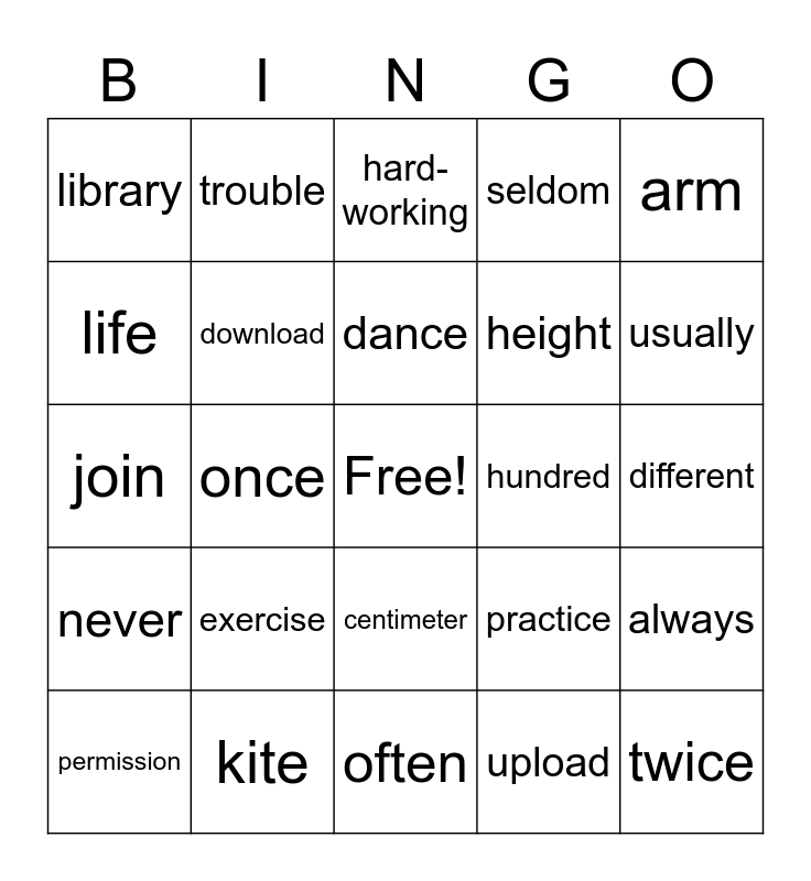This bingo card has a free space and 24 words: exercise, kite, dance, permission, arm, library, life, trouble, hundred, centimeter, height, join, practice, always, download, upload, different, hard-working, usually, once, twice, never, seldom and often.
