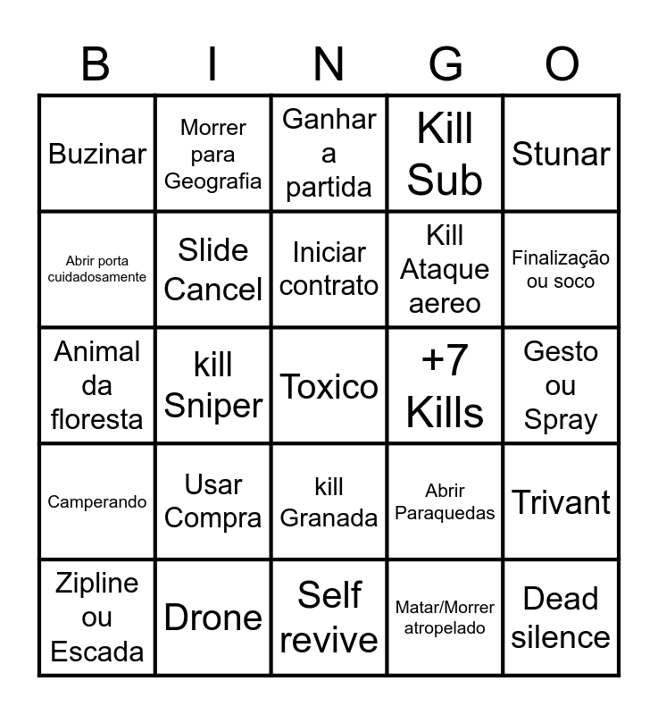 This bingo card has 39 words: Kill AR, Loadout, Veiculo, Slide Cancel, Zipline ou Escada, kill Granada, Iniciar contrato, Caixa muniçao ou placas, Stunar, Camperando, kill Sniper, Kill Sub, Toxico, Gesto ou Spray, +7 Kills, Usar Compra, Vant (UAV), Buzinar, Skin season, Abrir Paraquedas, Abrir porta cuidadosamente, Self revive, Kill Ataque aereo, Finalização ou soco, Quebrar as pernas, Mascara de gas, Dead silence, Encontrar Xitao, Exotico, Morrer para Geografia, Parkour, Explodir Carro, Ganhar a partida, Drone, Matar/Morrer atropelado, Deitar no chão, Trivant, Animal da floresta and Perks Novos.