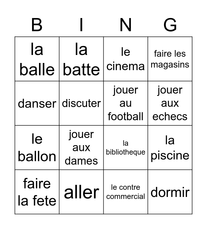 This bingo card has 16 words: aller, la piscine, le cinema, la balle, le ballon, la batte, la bibliotheque, le contre commercial, danser, discuter, faire la fete, faire les magasins, jouer aux dames, jouer aux echecs, jouer au football and dormir.