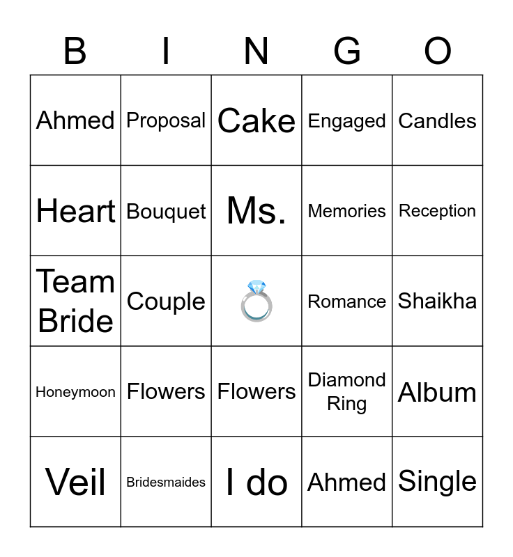 This bingo card has a free space and 34 words: Maid of Honor, Ahmed, White Dress, Husband, Honeymoon, Bouquet, Candles, Veil, Proposal, Team Groom, Ms., Cake, Wife, Shaikha, Romance, Reception, Bridesmaides, Team Bride, Flowers, Diamond Ring, Flowers, Bouquet, Ahmed, Shaikha, I do, Single, Engaged, Peonies, Memories, Heart, Just Married, Couple, Album and Lace.