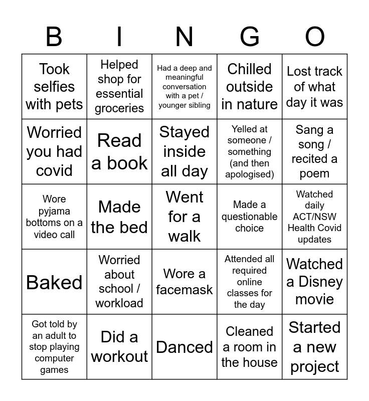 This bingo card has 40 words: Video called friends, Wore pyjama bottoms on a video call, Binged an entire series, Read a book, Did a workout, Wore a facemask, Stayed inside all day, Doom-scrolled news and media sites, Lost track of what day it was, Baked, Made the bed, Chilled outside in nature, Went for a walk, Watched daily ACT/NSW Health Covid updates, Made a questionable choice, Worried about school / workload, Got bored, Took selfies with pets, Did household chores during school hours, Had a deep and meaningful conversation with a pet / younger sibling, Watched a Disney movie, Cleaned a room in the house, Yelled at someone / something (and then apologised), Worried you had covid, Finished a block of chocolate in one sitting, Played a board/card game, Procrastinated from schoolwork, Dodged the “updated exposure locations” bullet, Started a new project, Built something, Performed a random act of kindness, Got told by an adult to stop playing computer games, Drew a picture, Attended all required online classes for the day, Sang a song / recited a poem, Danced, Prepared a meal, Practised social distancing, Helped shop for essential groceries and Wished you could go back to school.