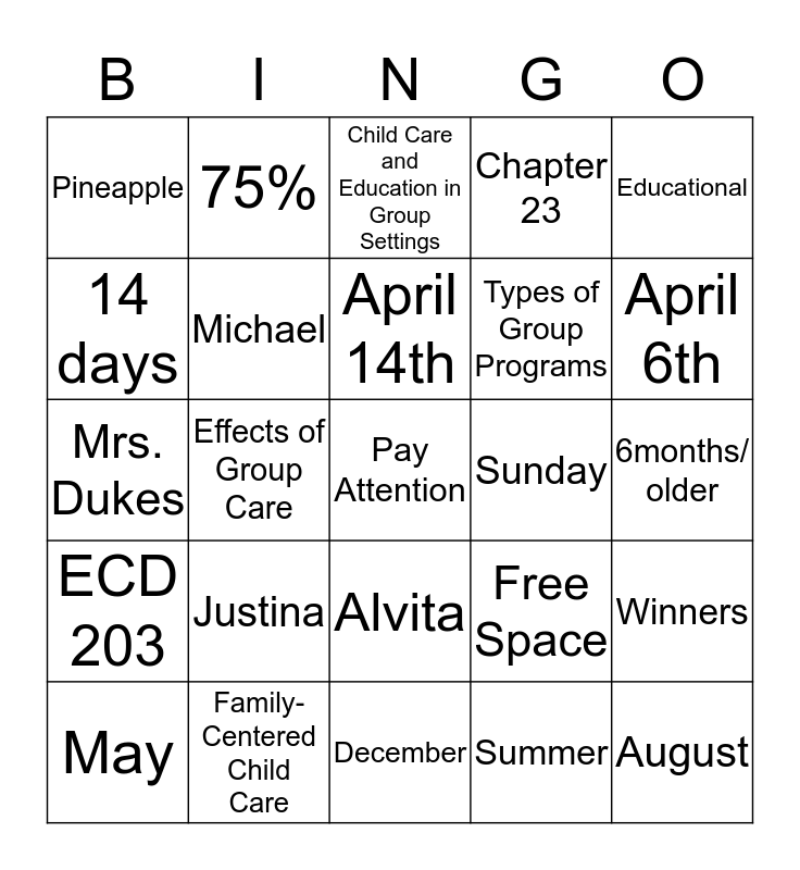 This bingo card has 25 words: Justina, December, April 14th, May, Educational, Pineapple, 14 days, 75%, Sunday, Alvita, Types of Group Programs, Mrs. Dukes, Free Space, Winners, Michael, August, 6months/ older, Child Care and Education in Group Settings, April 6th, Effects of Group Care, Pay Attention, Family-Centered Child Care, ECD 203, Chapter 23 and Summer.