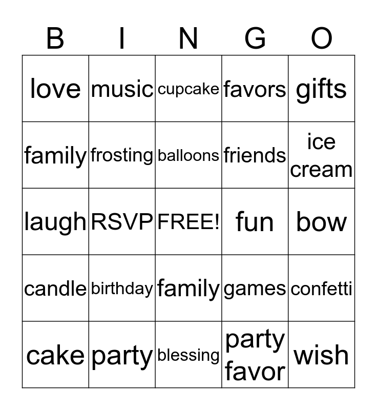 This bingo card has a free space and 24 words: birthday, party, balloons, cake, gifts, love, family, music, fun, family, friends, laugh, games, confetti, frosting, party favor, bow, cupcake, ice cream, RSVP, wish, candle, favors and blessing.