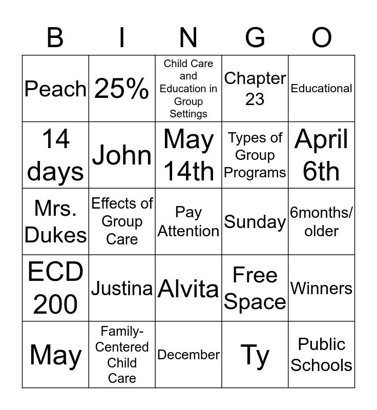 This bingo card has 25 words: Justina, December, May 14th, May, Educational, Peach, 14 days, 25%, Sunday, Alvita, Types of Group Programs, Mrs. Dukes, Free Space, Winners, John, Public Schools, 6months/ older, Child Care and Education in Group Settings, April 6th, Effects of Group Care, Pay Attention, Family-Centered Child Care, ECD 200, Chapter 23 and Ty.