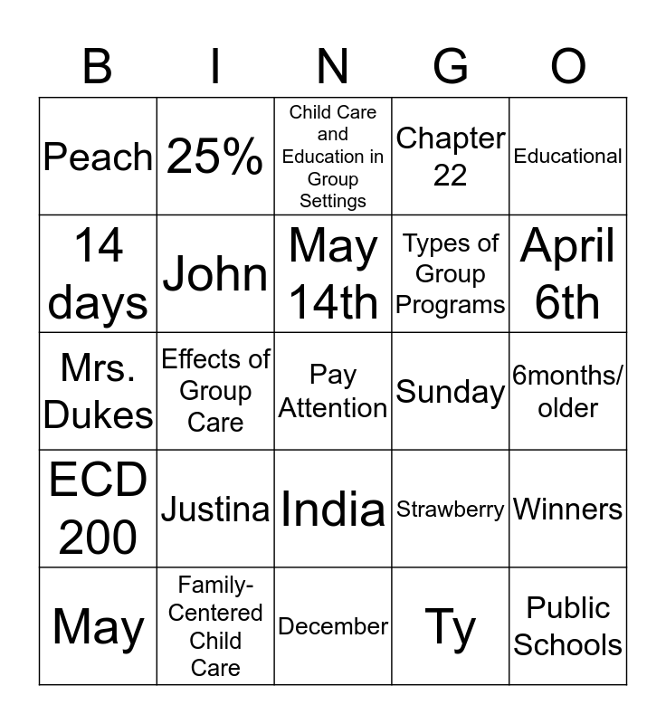 This bingo card has 25 words: Justina, December, May 14th, May, Educational, Peach, 14 days, 25%, Sunday, India, Types of Group Programs, Mrs. Dukes, Strawberry, Winners, John, Public Schools, 6months/ older, Child Care and Education in Group Settings, April 6th, Effects of Group Care, Pay Attention, Family-Centered Child Care, ECD 200, Chapter 22 and Ty.