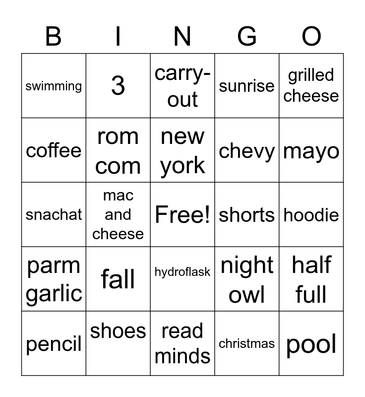 This bingo card has a free space and 24 words: fall, shoes, new york, pencil, grilled cheese, swimming, coffee, 3, shorts, hydroflask, chevy, snachat, night owl, half full, rom com, christmas, hoodie, carry-out, mayo, mac and cheese, pool, parm garlic, sunrise and read minds.