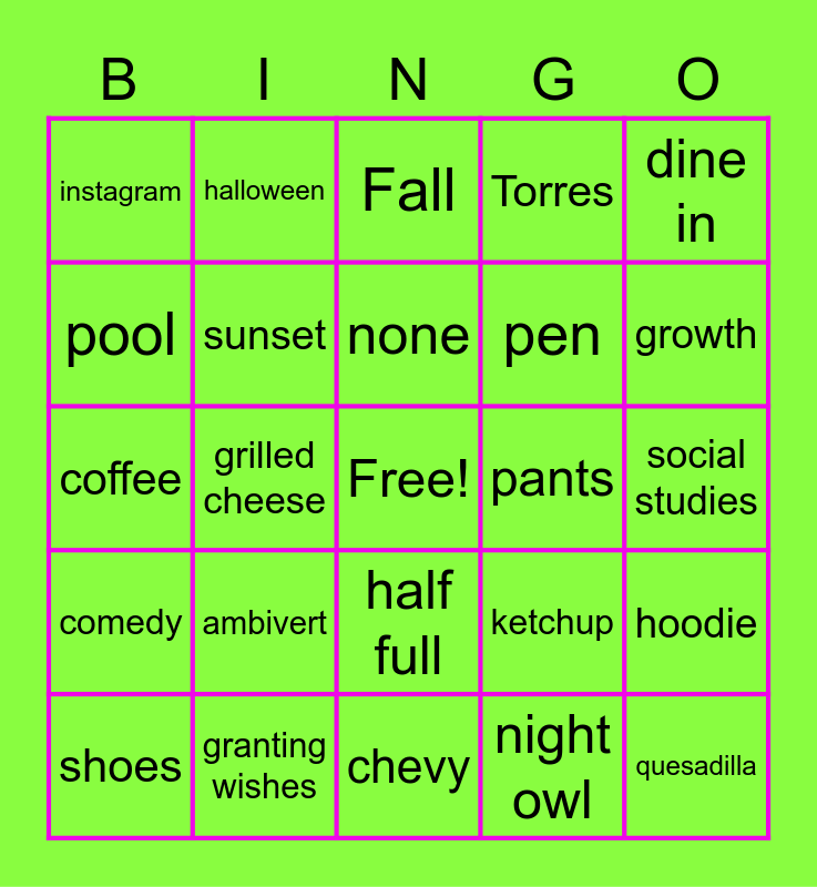 This bingo card has a free space and 24 words: ambivert, granting wishes, none, shoes, dine in, instagram, pool, halloween, pants, half full, pen, coffee, ketchup, hoodie, sunset, night owl, social studies, Fall, growth, grilled cheese, quesadilla, comedy, Torres and chevy.