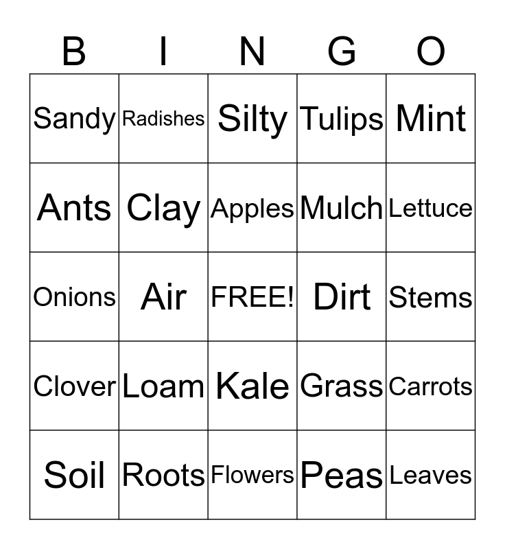 This bingo card has a free space and 29 words: Soil, Thirsty, Air, Nutrients, Sandy, Silty, Clay, Loam, Dirt, Roots, Stems, Leaves, Flowers, Peas, Lettuce, Sun Light, Kale, Clover, Mint, Onions, Grass, Petals, Mulch, Ants, Tulips, Radishes, Carrots, Apples and Compost.